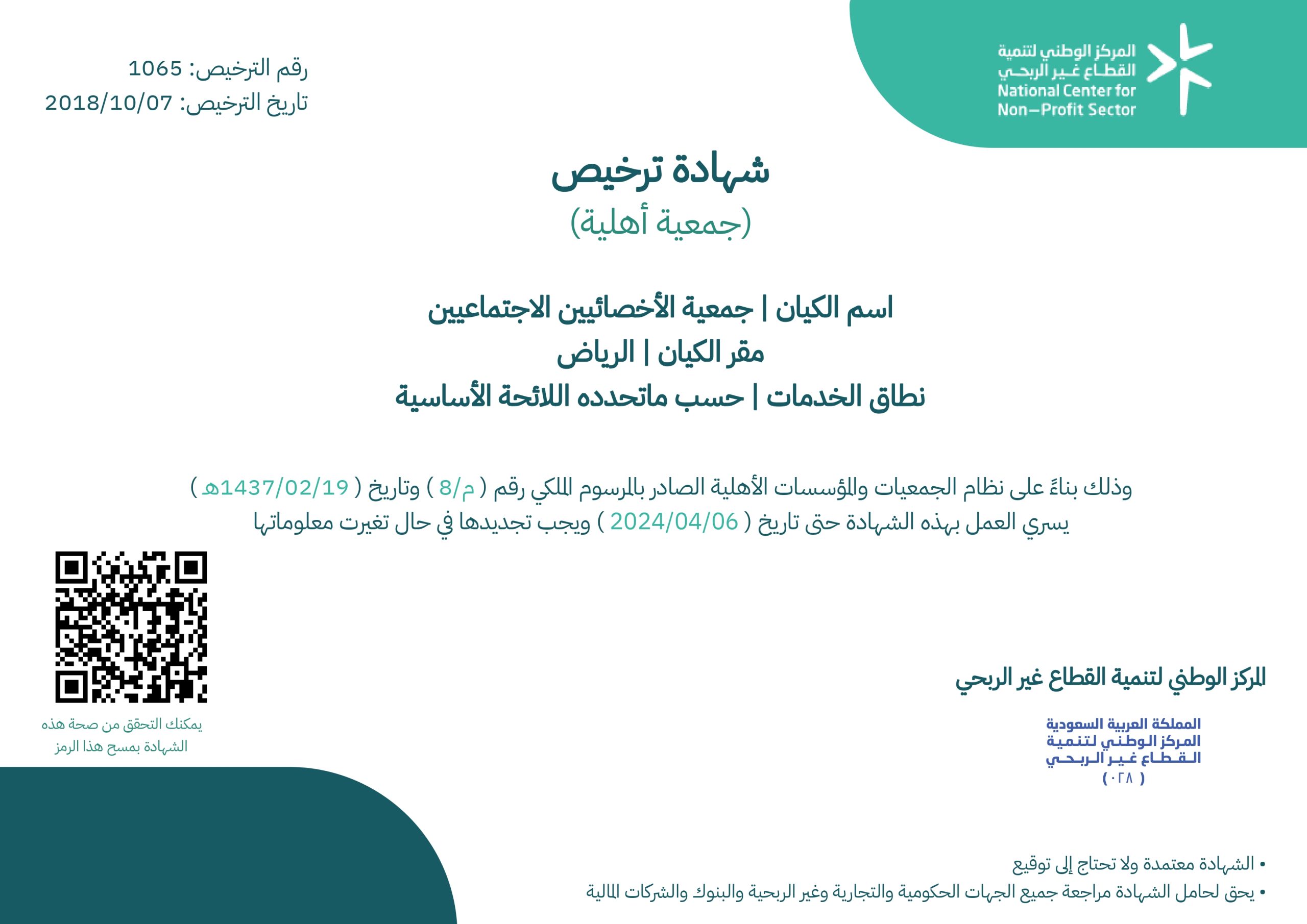 تأسست جمعية الأخصائيين الاجتماعيين (ASW) في عام 2018 برقم ( 1065) من وزارة الموارد البشرية والتنمية الاجتماعية، وهي جمعية مهنية تضم في عضويتها الأخصائيين الاجتماعيين المحترفين في المملكة العربية السعودية ، وتعمل (ASW) على تعزيز النمو المهني وتطوير أعضائها المنضمين لعضويتها، من أجل إنشاء والحفاظ على المعايير المهنية ، وتعزيز السياسات الاجتماعية السليمة.