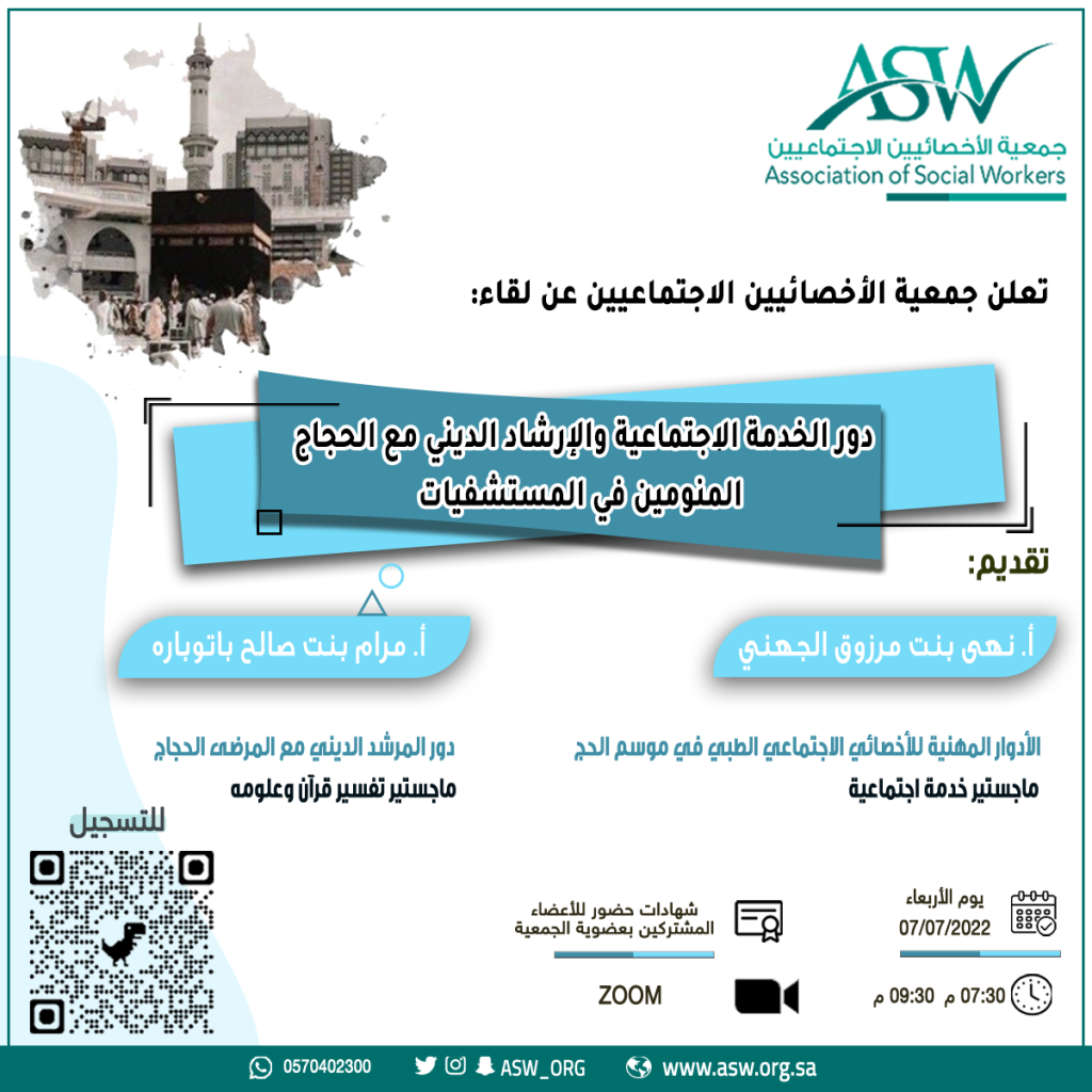 تعلن جمعية الأخصائيين الاجتماعيين عن بدء التسجيل في اللقاء العلمي بعنوان “دور الخدمة الاجتماعية والإرشاد الديني مع الحجاج المنومين